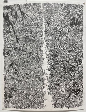 Faire de l'art est un processus d'apparition-disparition — ou plutôt c'est une façon de chuchoter aux fantômes. Dans l'atelier, je me tiens entre deux peintures que j'ai faites. Celle qui se trouve derrière moi est sur toile et elle est punaisée au mur. Celle que je tiens devant moi est sur une gaze translucide, et je la déplace, assez doucement, selon une chorégraphie. De l'autre côté de la pièce, il y a un appareil photo sur un pied qui est réglé pour prendre des photos avec une vitesse d'obturateur lente. Lorsque je bouge, les lignes se brouillent et les formes qu'elles font se modifient. Mon corps disparaît pour laisser place à autre chose.